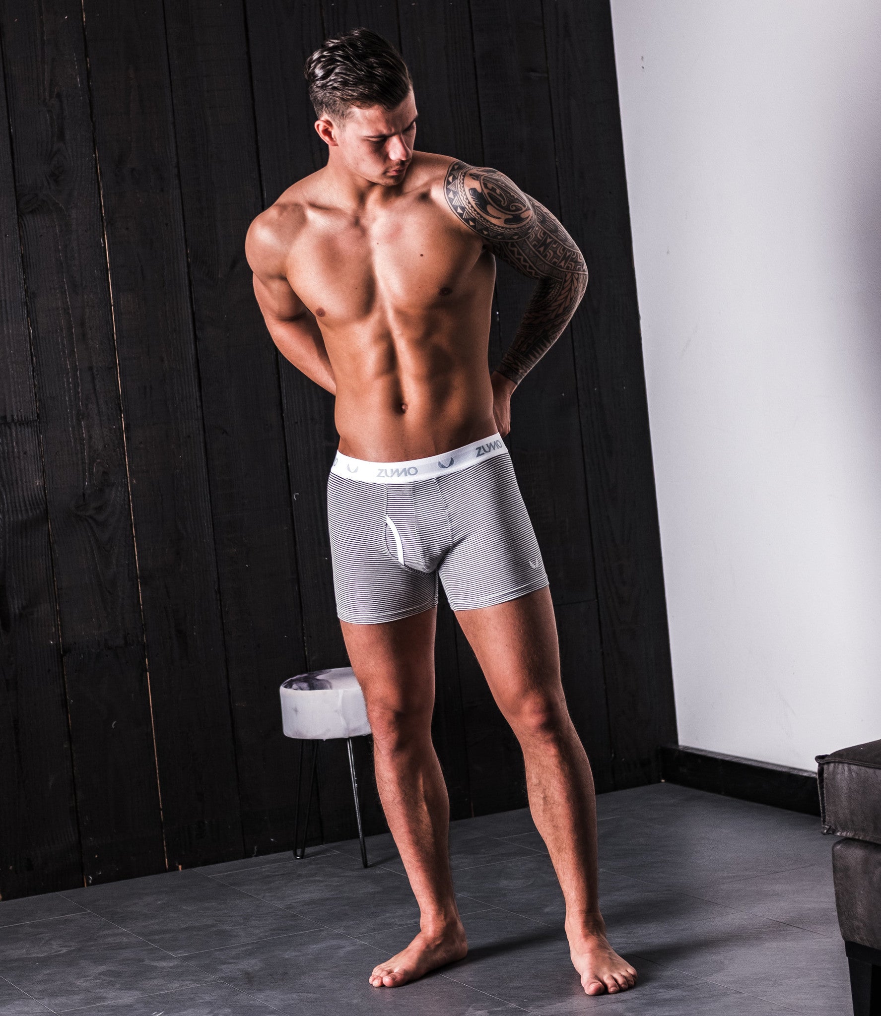 The Merlin-Stripe is a slim fit boxer brief with a striped pattern. The luxurious cotton blend feels soft and has enough stretch for extra comfort, thanks to the elastic band it fits well around the waist. Our logo is visible on the band as well as embroidered on the left leg for extra detail.