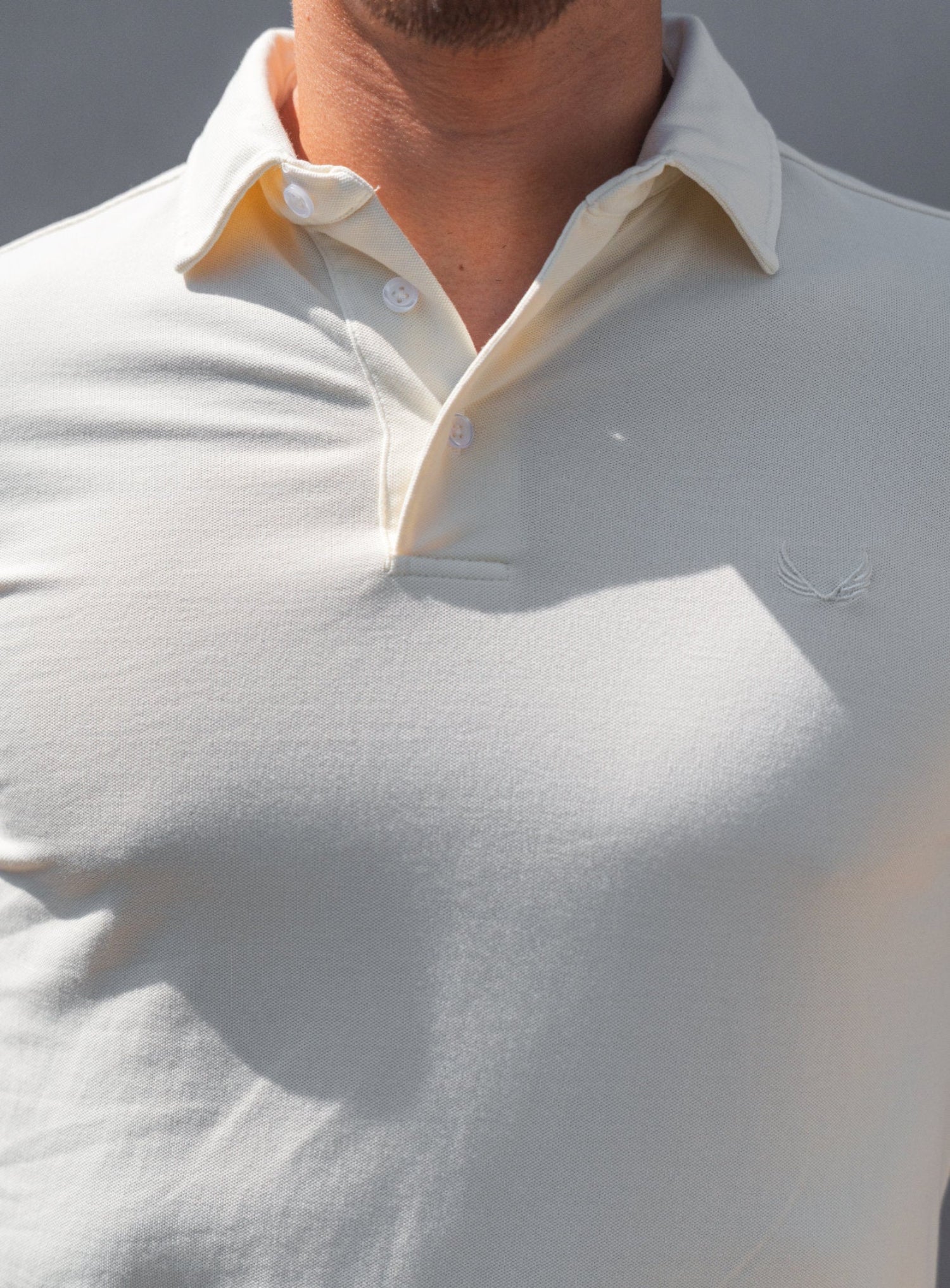 - Classic polo collar with button closure