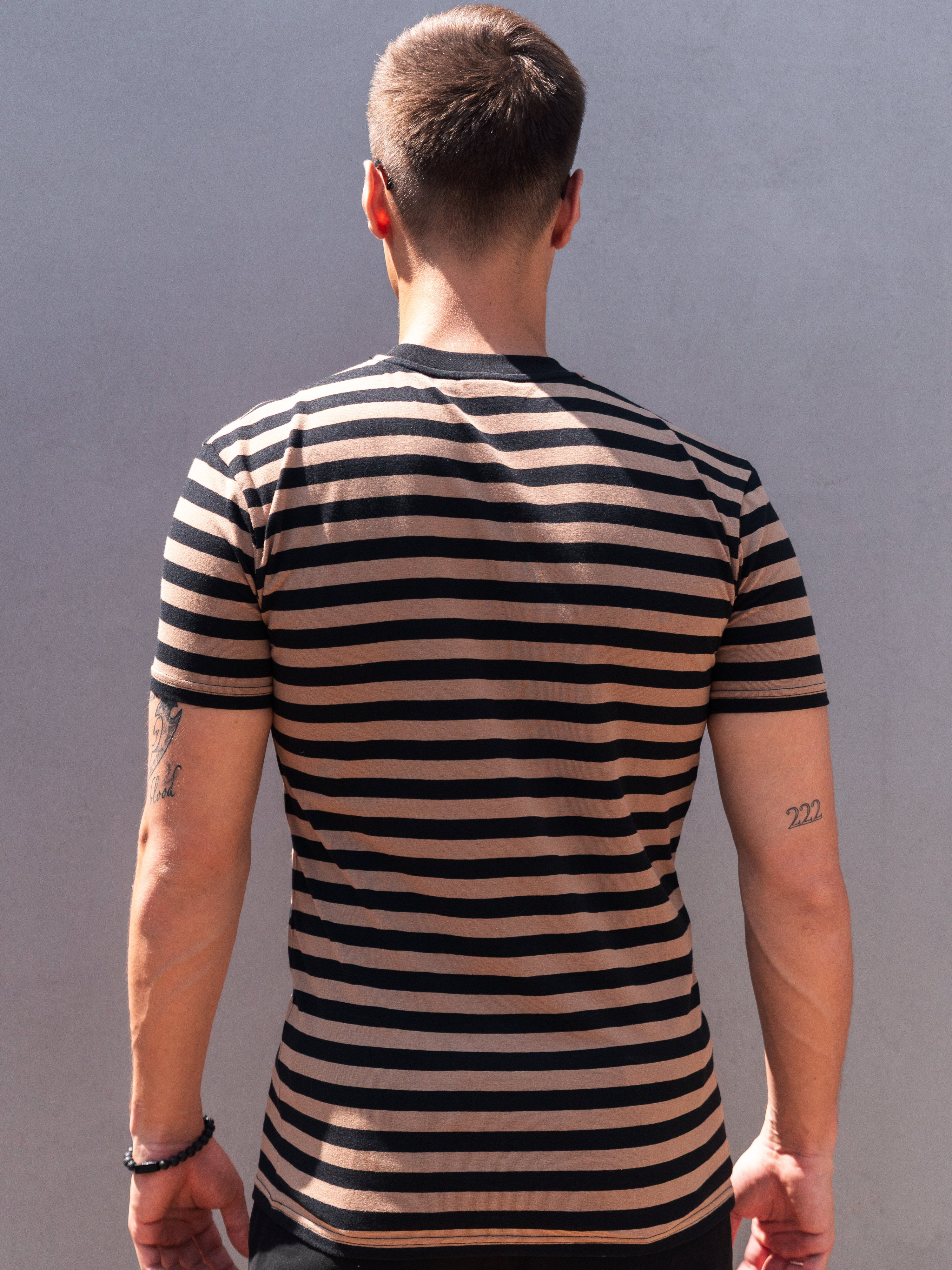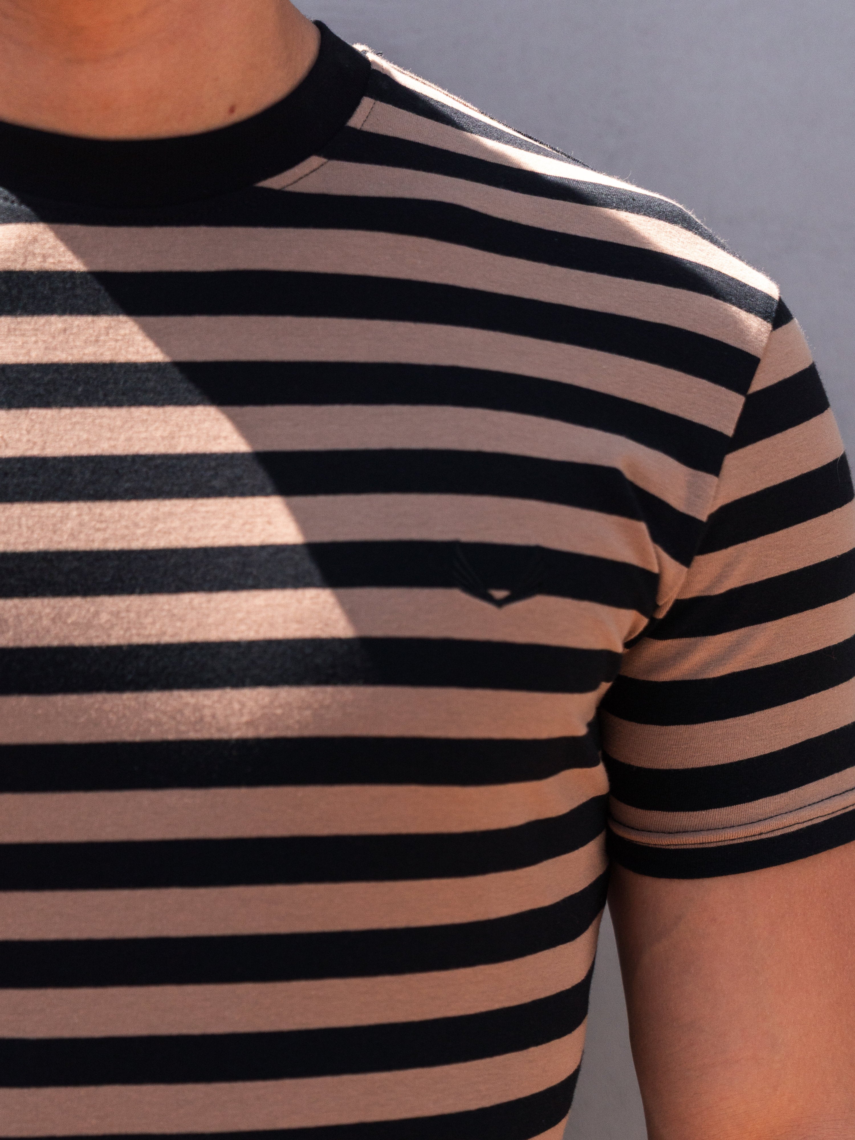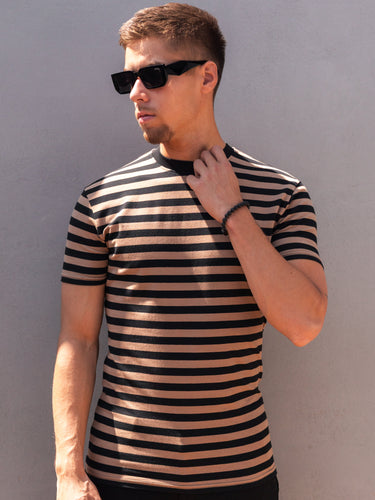 The Stone Striped tee keeps it fitted, clean and sharp with a classic twist. Designed in a slim fit that highlights the upper body, it brings a bold stripe pattern without going over the top. The soft knit feels smooth on the skin and moves with you throughout the day. Contrast trim at the collar and sleeves adds a subtle retro touch that pulls the whole look together.