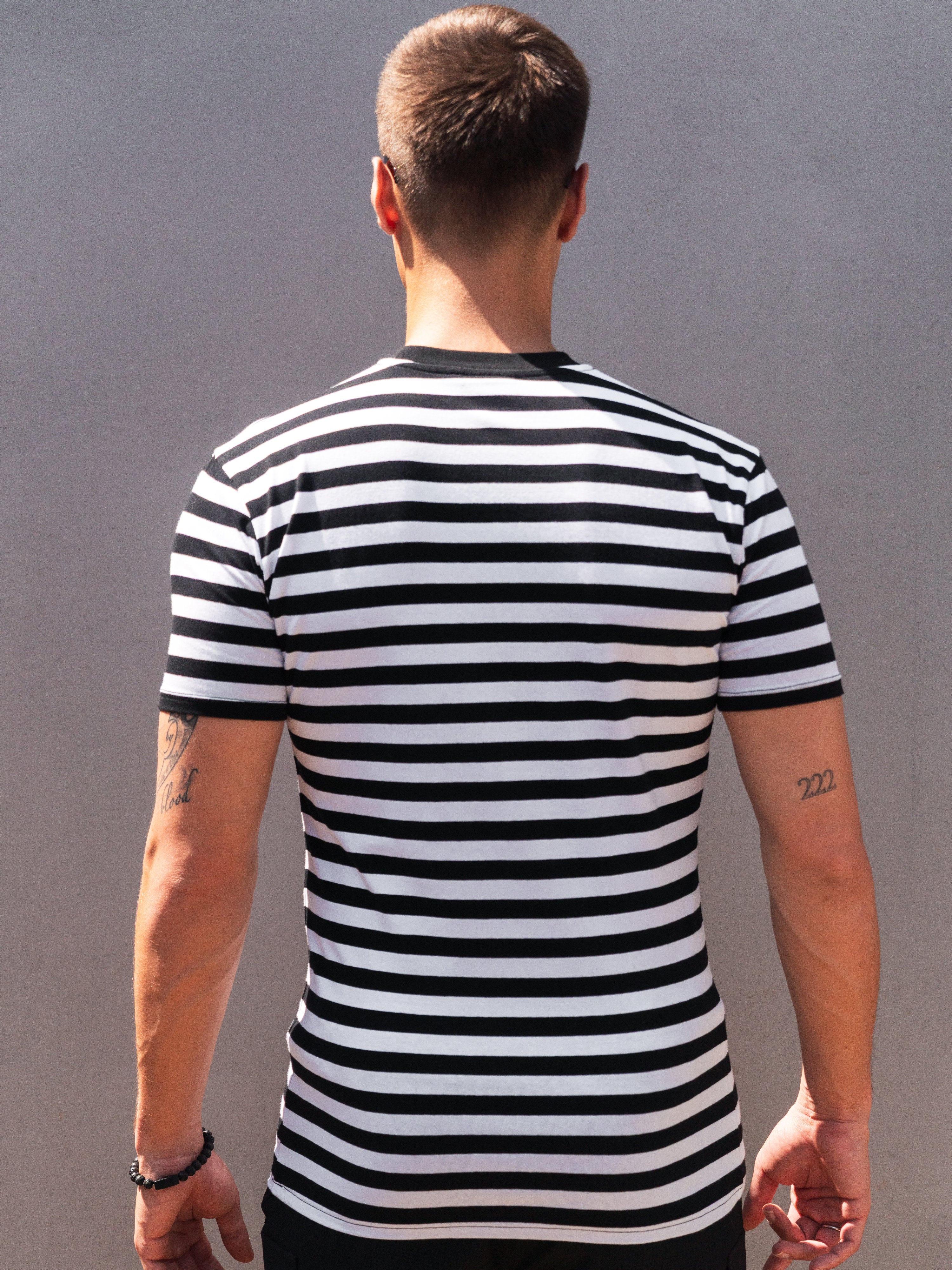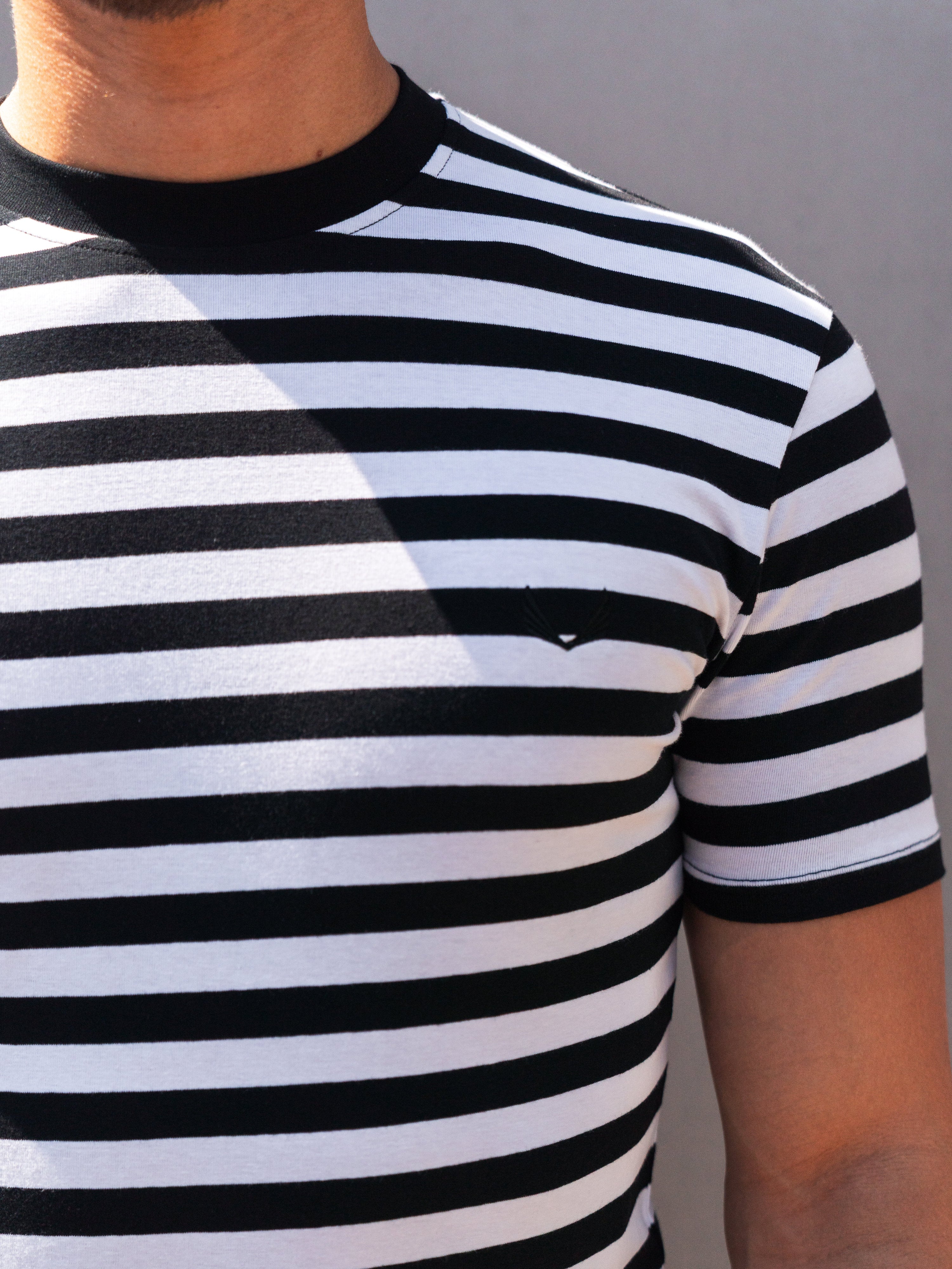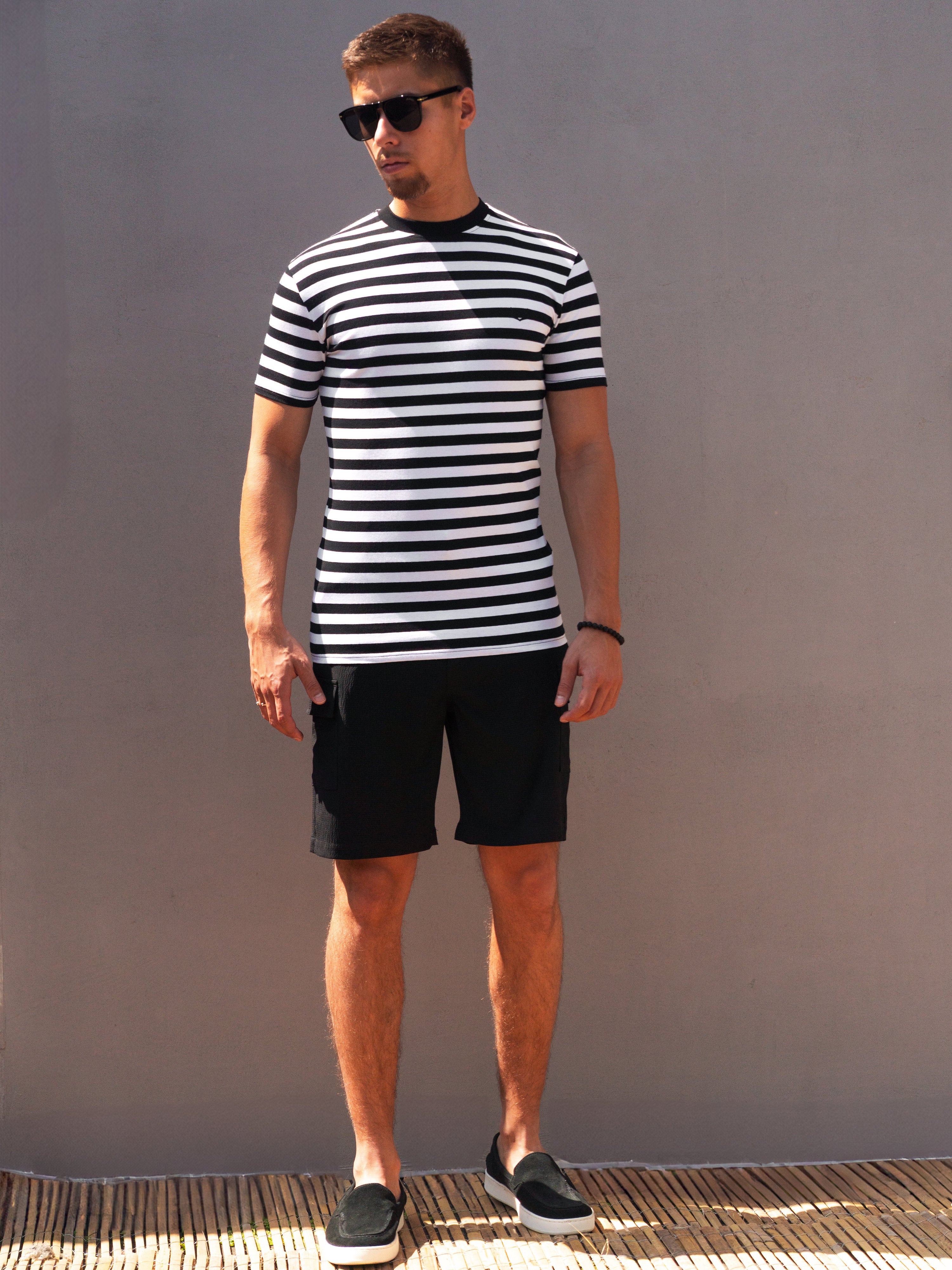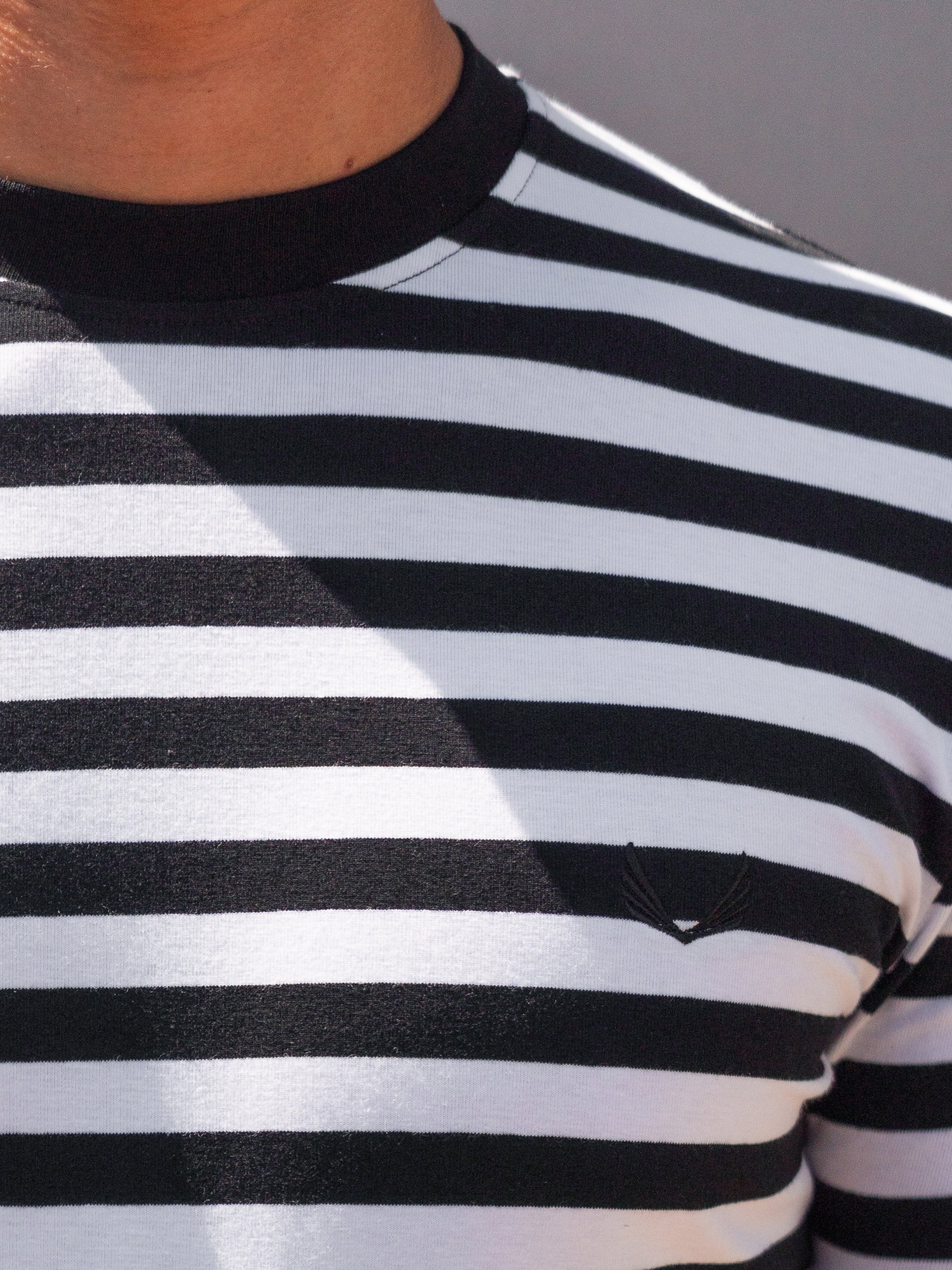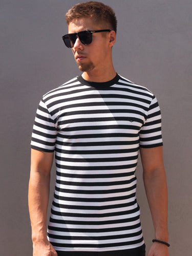 The Stone Striped tee keeps it fitted, clean and sharp with a classic twist. Designed in a slim fit that highlights the upper body, it brings a bold stripe pattern without going over the top. The soft knit feels smooth on the skin and moves with you throughout the day. Contrast trim at the collar and sleeves adds a subtle retro touch that pulls the whole look together.