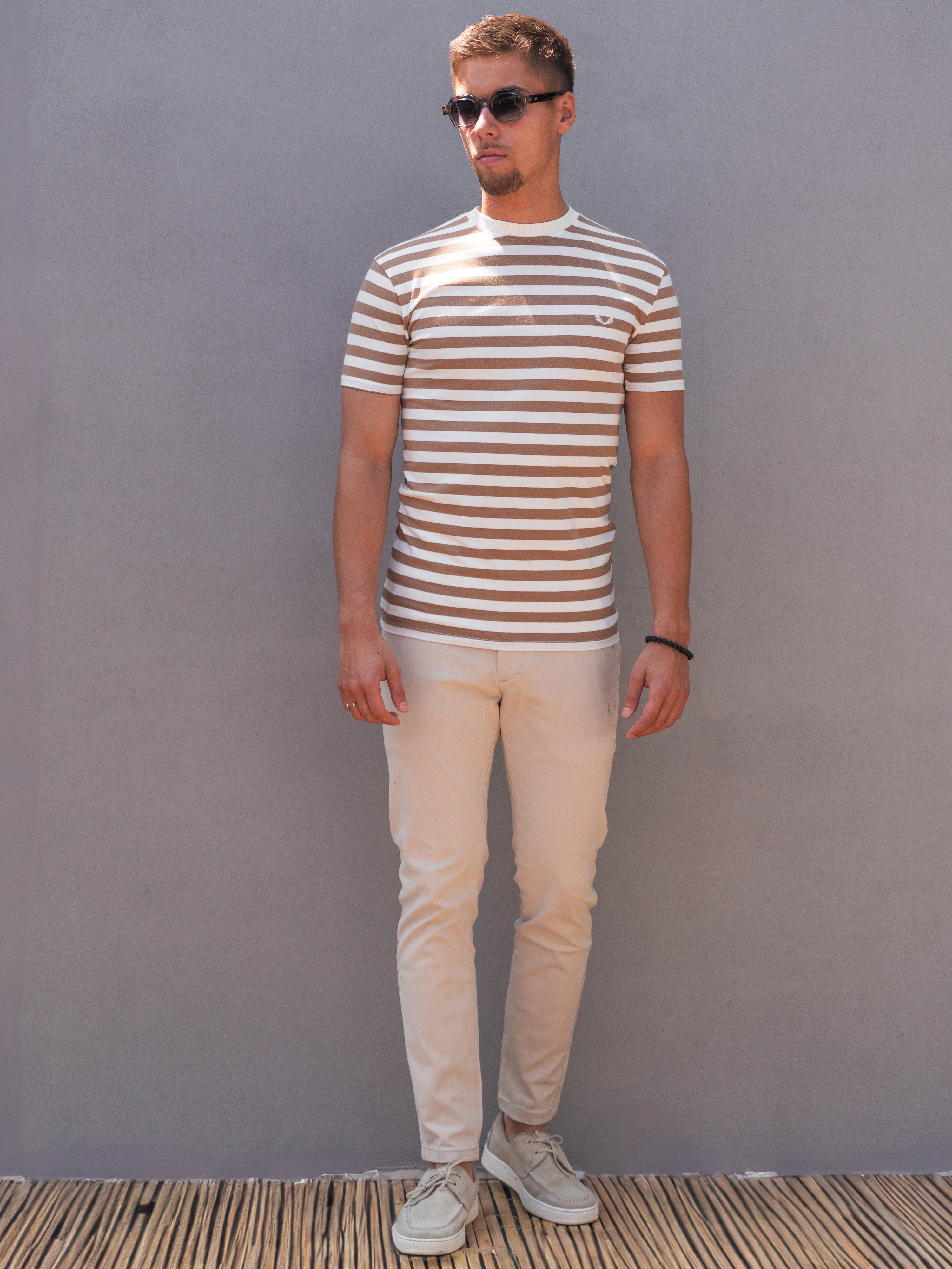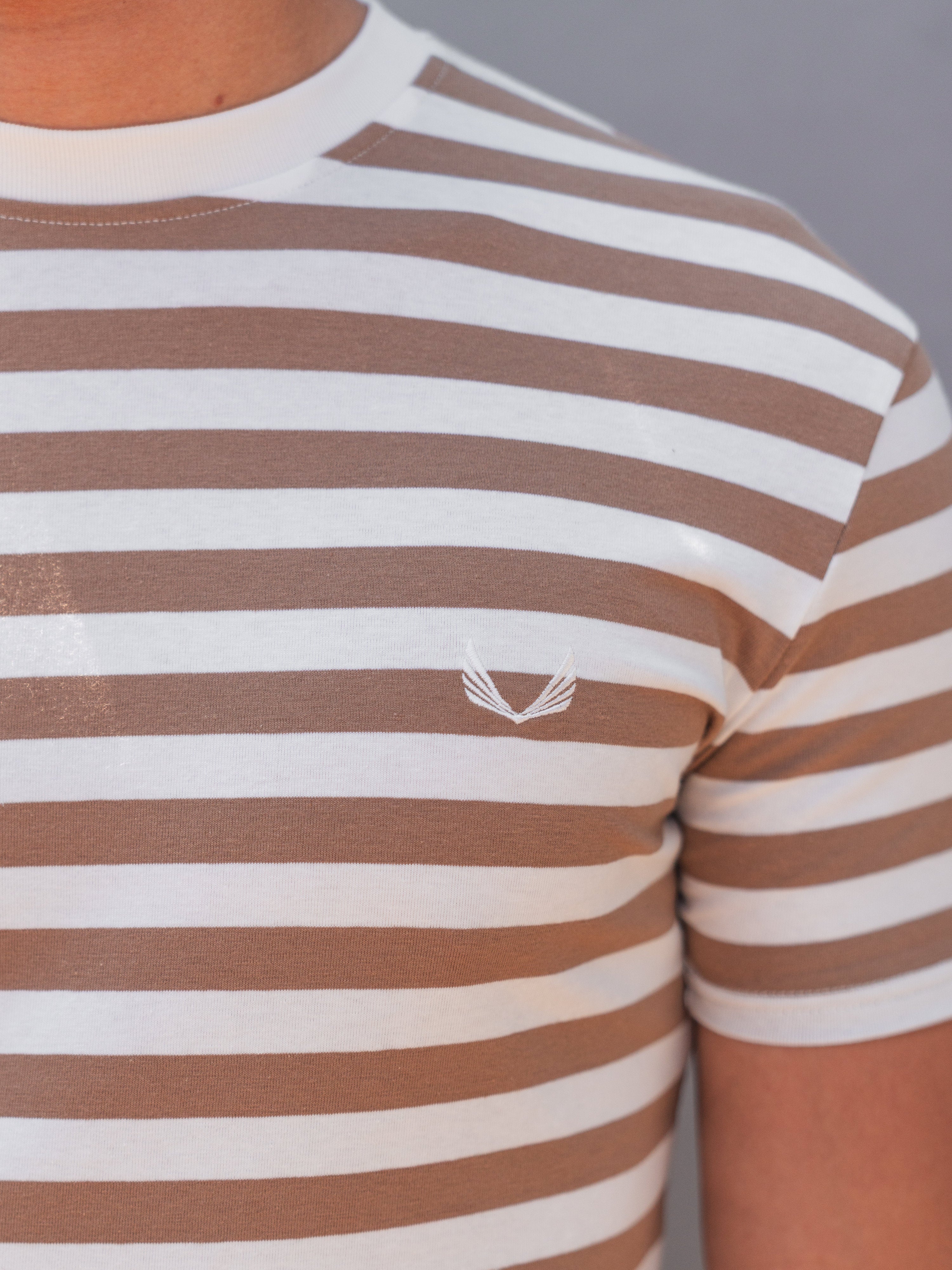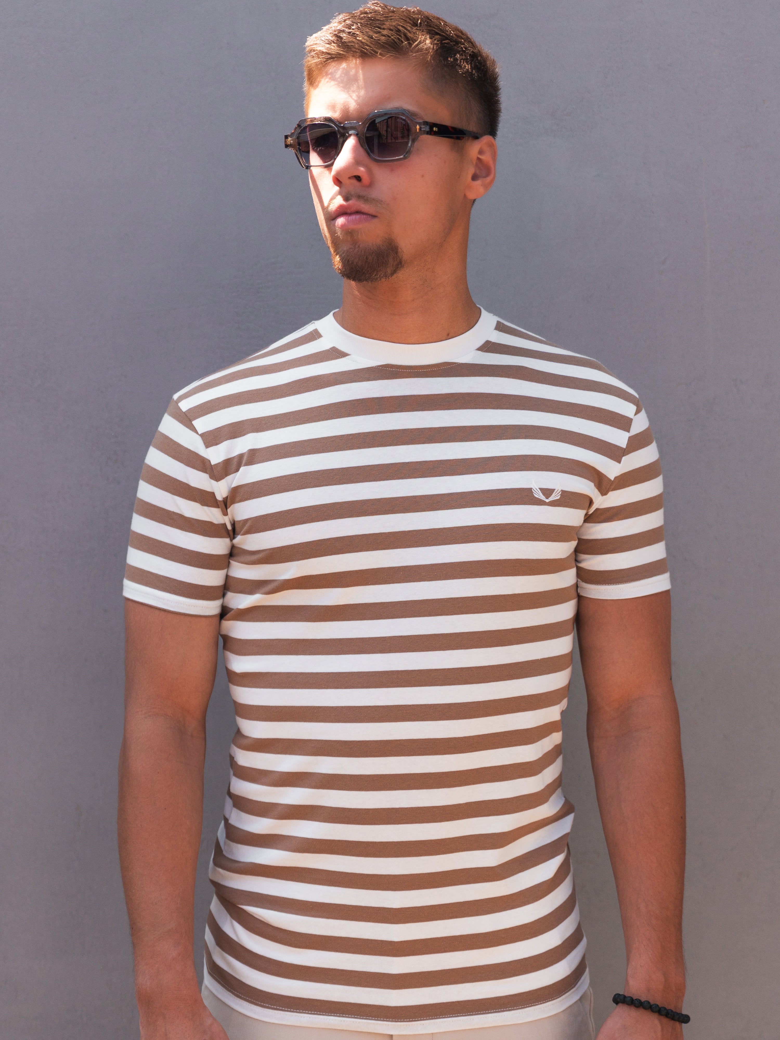The Stone Striped tee keeps it fitted, clean and sharp with a classic twist. Designed in a slim fit that highlights the upper body, it brings a bold stripe pattern without going over the top. The soft knit feels smooth on the skin and moves with you throughout the day. Contrast trim at the collar and sleeves adds a subtle retro touch that pulls the whole look together.